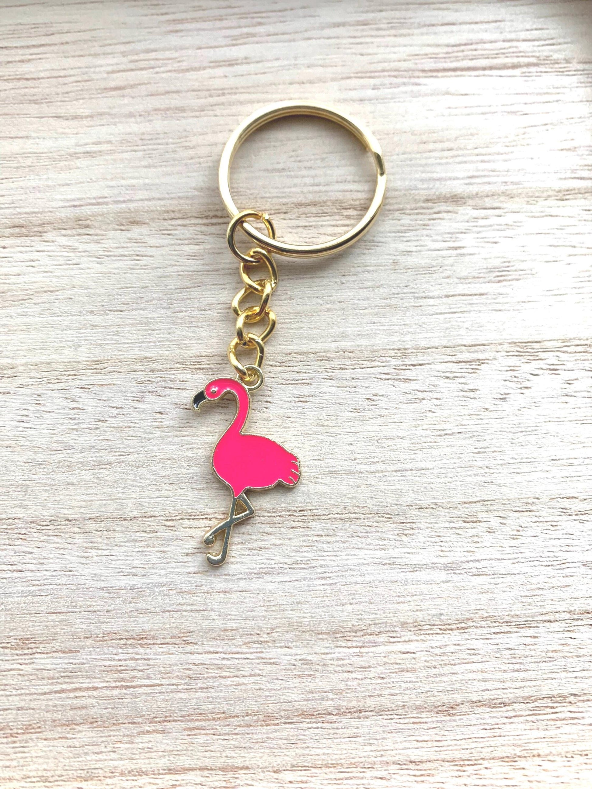 A pretty pink flamingo charm attached to a gold coloured keyring